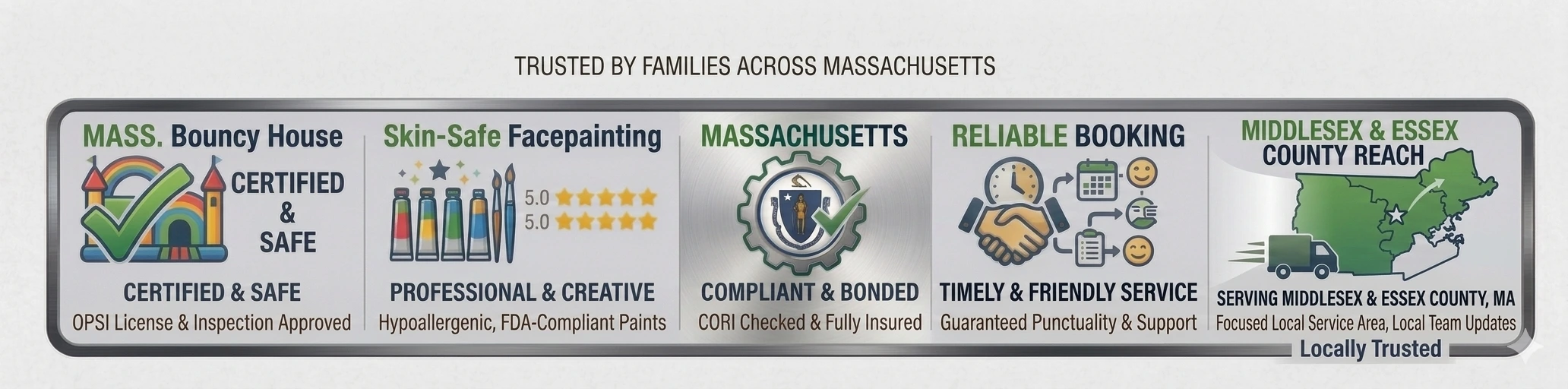 • Yes, we are fully insured and certified by the state of Massachusetts to operate our bounce houses — insurance was a prerequisite to obtain our license.